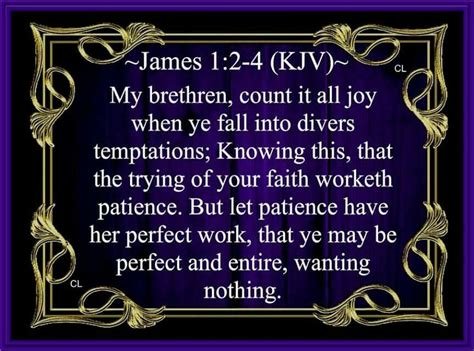 knowing this, that the trying of your faith worketh patientce. But let patient have her perfect work, so that ye may be perfect and entire, wanting nothing.